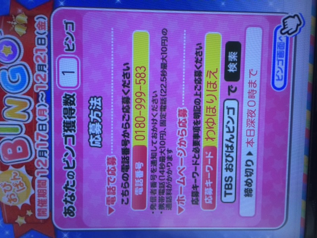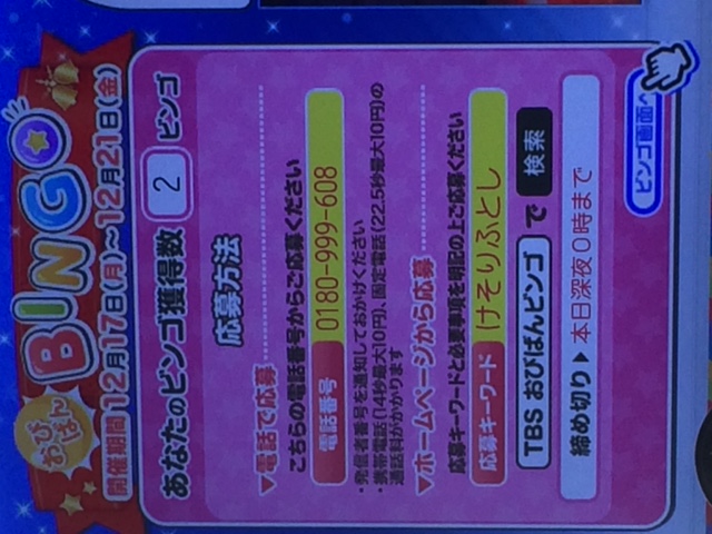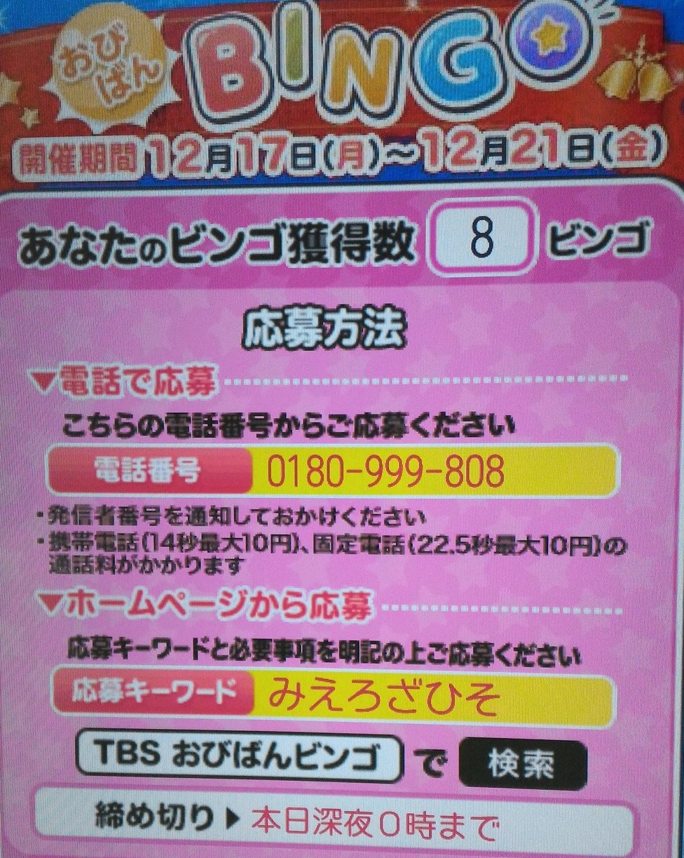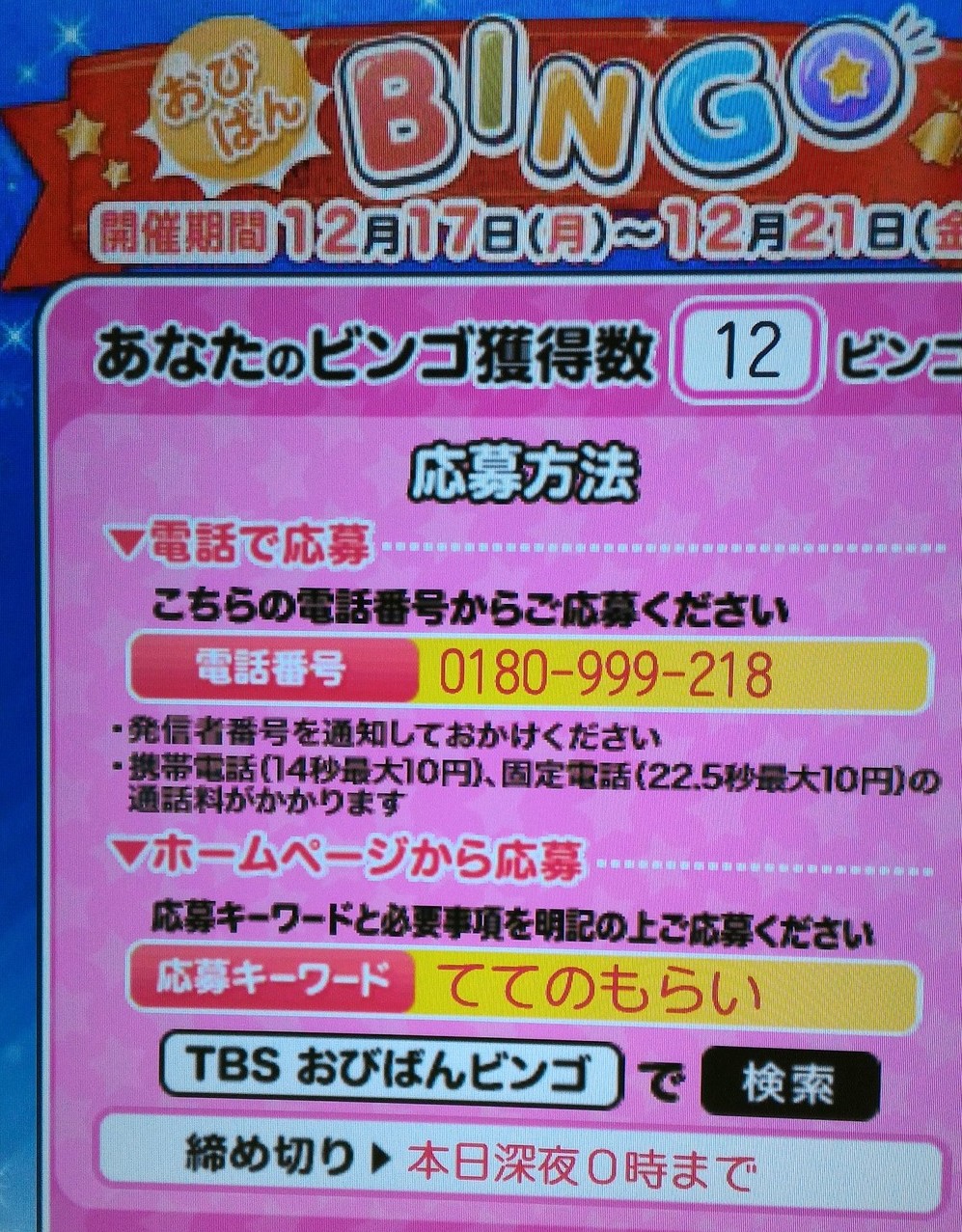 気になる12月17日のビンゴの結果のキーワード・答えと応募電話番号は下に貼っておきますのでご利用下さい。