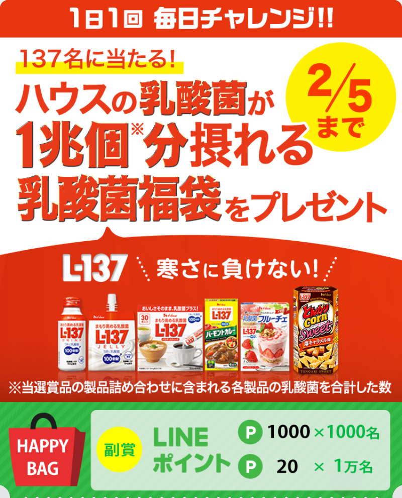 ・A賞:乳酸菌L137製品 詰め合わせ(乳酸菌1兆個※相当を含む 約1万3千円相当)×137名