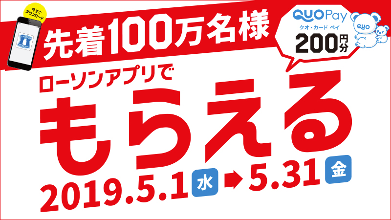 【先着100万名】ローソンアプリにローソンIDでログインするとQUOカードPay 200円分がもらえる♪5/31まで