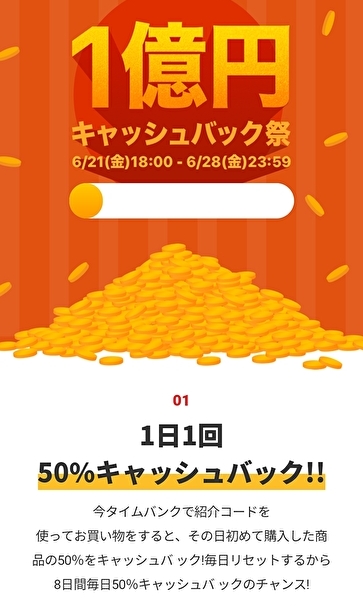 【何でも、1日1回50%キャッシュバック!】タイムバンクで1億円キャッシュバック祭♪半額の半額で買える!!早期終了前に買うべし!6/28まで