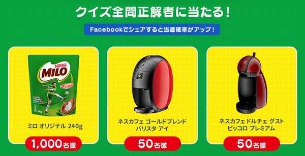 ☞ クイズに答えて「ネスレ ミロ オリジナル 240g」が抽選で1,000名様にプレゼントキャンペーン はこちら